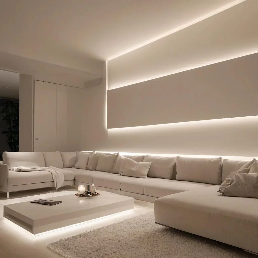 Профессиональный дизайн гостиной использует скрытое освещение. Фоновая подсветка мебели создает уют. Световой сценарий и умный дом меняют интерьер. Многоцветная лента RGB дает акцент‚ а диммер — яркость. Диод SMD и алюминиевый профиль создают световой поток. Пульт управления и контроллер настраивают декор. Одноцветная лента подчеркивает ниши. Ремонт прячет вольтаж‚ блок питания и коннектор.